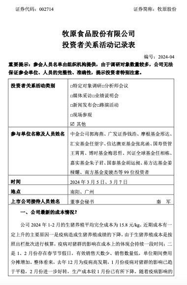 牧原股份向投资者介绍了公司最新的成本情况。公司2024年1-2月的生猪养殖平均完全成本为15.8元/kg。近期成本有一定上升的主要原因一是疫病造成生猪养殖成绩的下降,由于生猪养殖成本是按照出栏批次进行核算,疫病对猪群的影响在成本上的体现会持续一段时间;二是1、2月份存在春节节假日,有效销售天数少、销售数量低,单位期间费用分摊增加。整体看来,去年12月为疫病高发期,1月份疫病对猪群的影响已趋于平稳,2月份进一步好转,生产成本较1月份已有所下降。随着疫病影响的减弱及费用摊销的下降,预期公司未来生猪养殖成本会进一步下降。