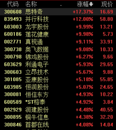 算力租赁概念领涨,截至午间收盘,思特奇涨超17%,龙宇股份、莲花健康等3股涨停,奥飞数据、锦鸡股份、利通电子等跟涨。